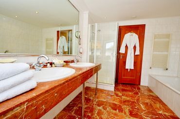Im Badezimmer Marmorboden mit Fußbodenheizung und Marmorwaschtisch. Badewanne sowie Dusche, Doppelwaschtisch und Telefon im Bad