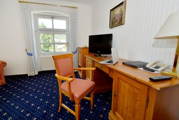 Unsere großzügig geschnittene Junior Suite Weser bietet ausreichend Platz zum Wohlfühlen. Durch die Sitzecke mit ausziehbarer Hotel-Couch mit Federkernmatratze ist dieses Zimmer als Familienzimmer ideal. Zusätzlich besteht eine Verbindungstür zum benachbarten Fulda Zimmer, welches ebenfalls als Doppelzimmer reserviert werden kann